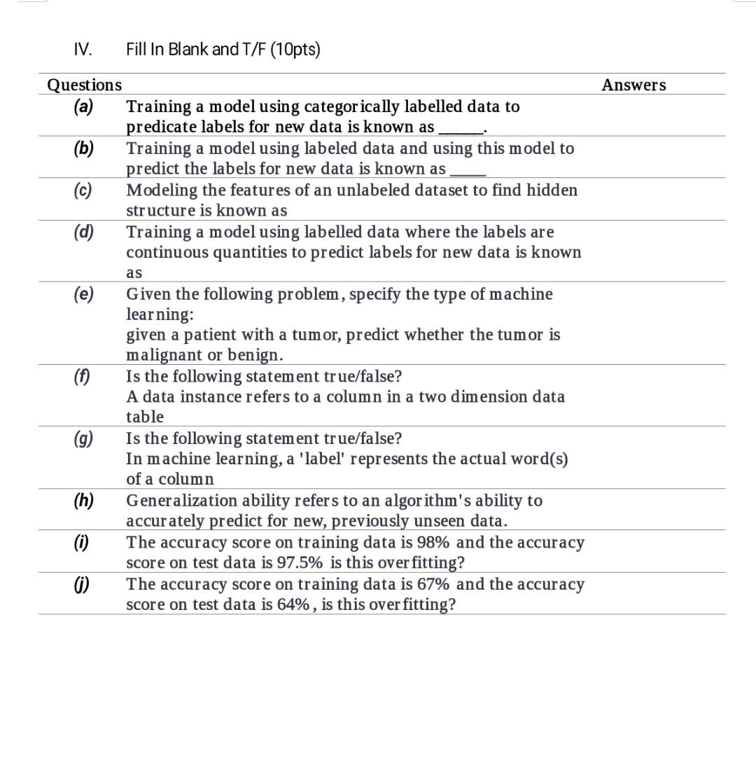 Module 1 Quiz.docx - Module 1 Quiz 测验, 10 个问题 1 point 1。... The key purpose of splitting the dataset into training and test sets is: To estimate how well the learned model will generalize to new data To reduce the amount of labelled data needed for evaluating classifier accuracy To reduce the number of features we need to consider as input to the learning algorithm To speed up the training process Solved IV. Fill In Blank and T/F (10pts) Answers Questions | Chegg.com fill in blank and t/f (10pts) answers questions (a) training a model using categorically labelled data to predicate labels for new data is known as (b) training a model using labeled data and using this model to predict the labels for new data is known as (c) modeling the features of an unlabeled dataset to find hidden structure is known as (d) …